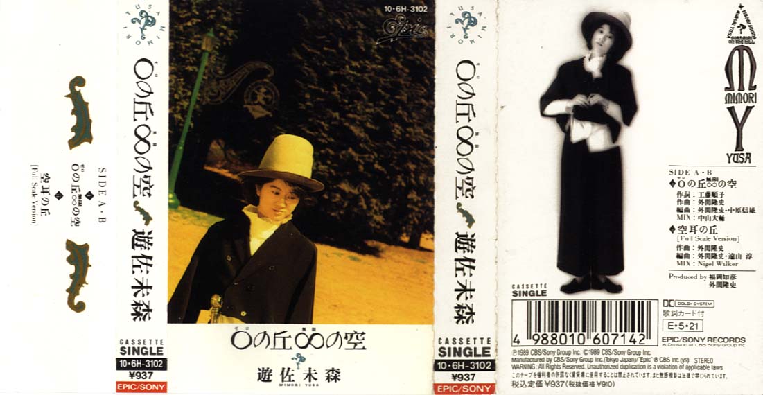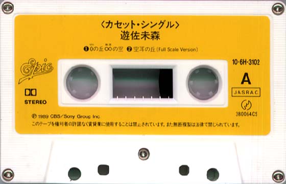 遊佐未森初期に発売されたミュージックテープ。現存しているのは非常に珍しい。この作品以降はカセットテープでの供給は無くなっている。 ジャケット部分はCDsと同一であるが、若干トリミングをして、天方向が短くなっている。カセットの方は天地方向が短いのでレイアウトも若干異なっている。 歌詞カードは折り畳まれているため、CDsよりも大変大きくなっている。 曲の収録順はCDsと同一であるが、「0の丘∞の空」「空耳の丘」を連続してA面に収録、B面も同様に収録となっている。 |